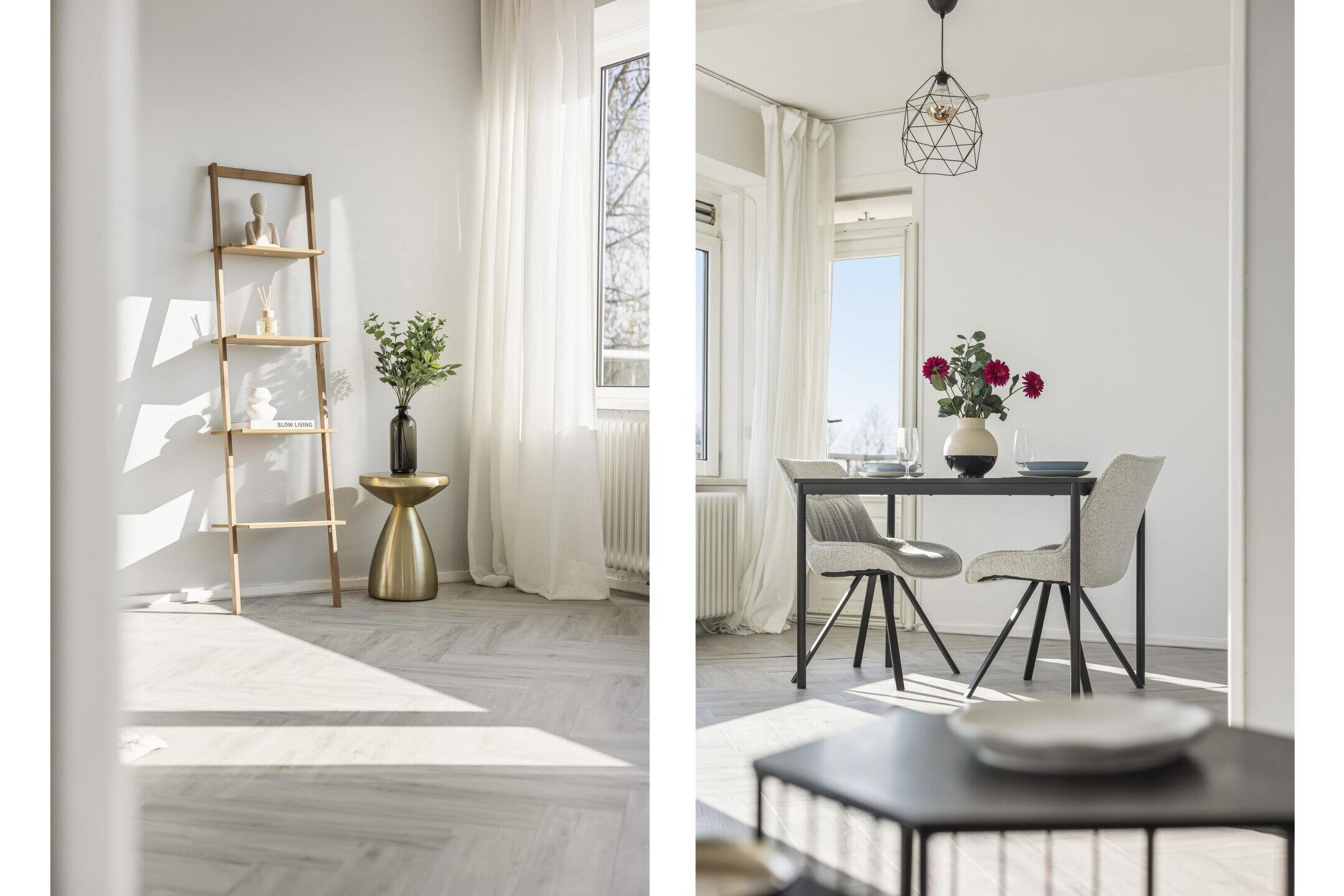 The spacious and very bright living room, with a separate dining room, forms the heart of the home and immediately stands out thanks to the large windows, which ensure this space enjoys an abundance of natural light. From the dining room, you have access to the east-facing balcony, where you can enjoy the unobstructed view of greenery and water.