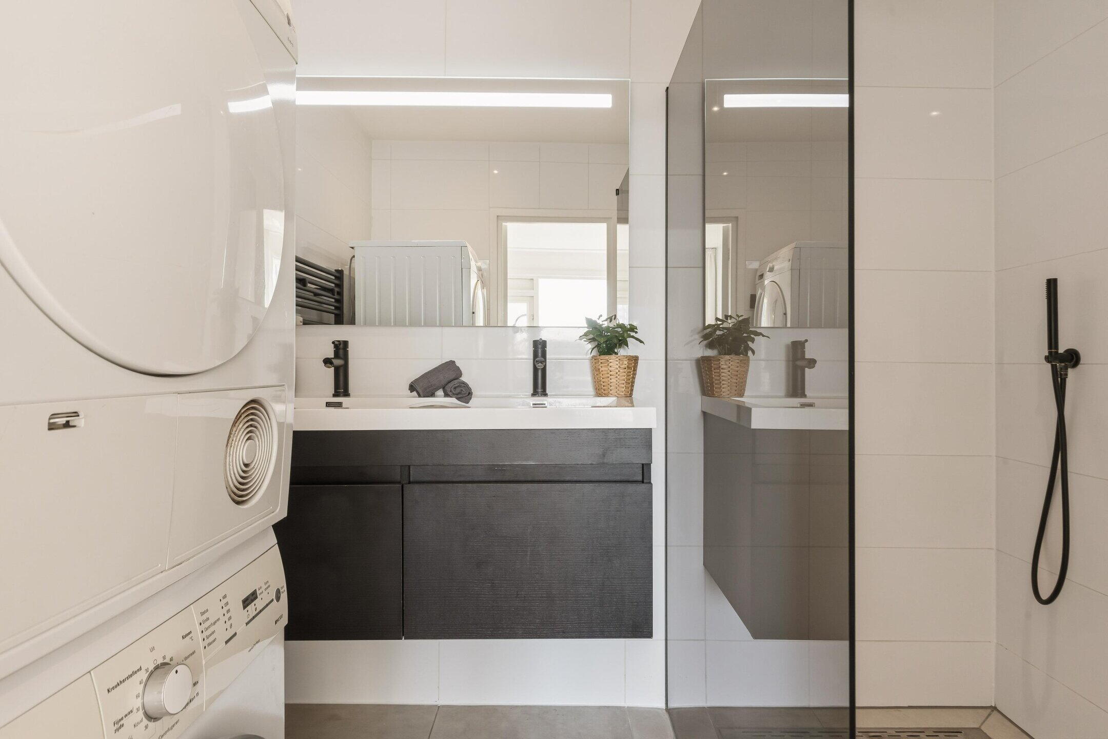- Dubbele wastafel, wastafelmeubel, inloopdouche, wasmachineaansluiting